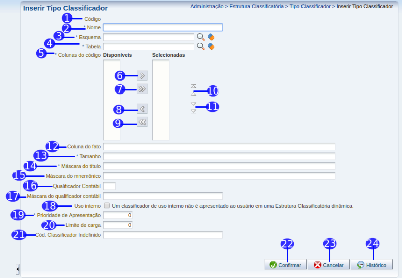 18 Botão Confirmar Efetiva a inclusão do tipo de classificador.