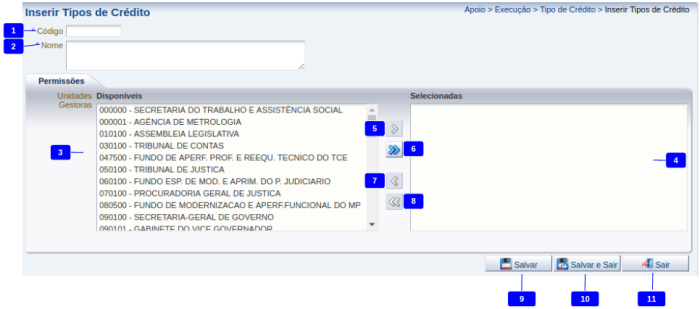 | 10 | Salvar e Sair | Clique no botão salvar e sair para a inclusão do registro de tipo de crédito e sair na tela de edição. |